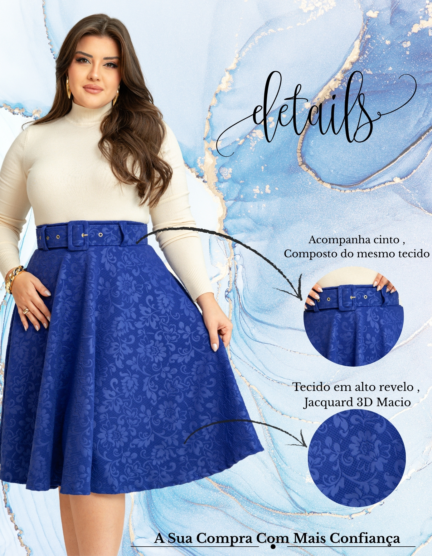 Ideal para compor produções de moda evangélica, a saia acompanha um cinto delicado que ajusta a cintura, acentuando a silhueta de forma discreta e elegante. Seu comprimento midi é ideal para quem busca um visual comportado, sem abrir mão do estilo. Versátil, pode ser usada em diversas ocasiões, como cultos, eventos sociais ou até mesmo em um dia casual com um toque de elegância.