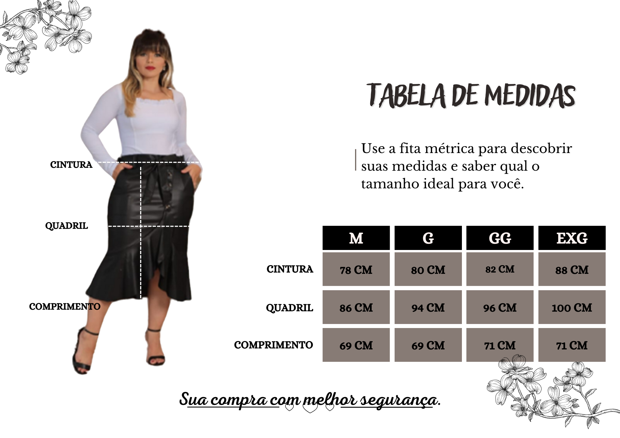 A nossa Saia Midi é um modelo que seu comprimento acaba abaixo do joelho e é mais ajustada na parte superior e começa a abrir na altura dos quadris deixandoa levemente rodada